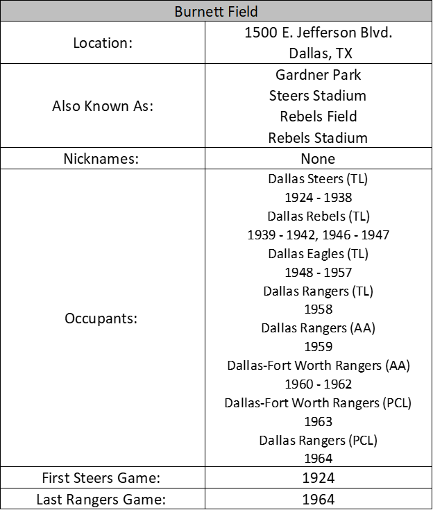 Ballparks, Baseball Feats Burnett Field (Dallas) Date: November 1, 2021Author: willb2032 0 Comments Share this: Click to share on X (Opens in new window) X Click to share on Facebook (Opens in new window) Facebook Like Loading... Related