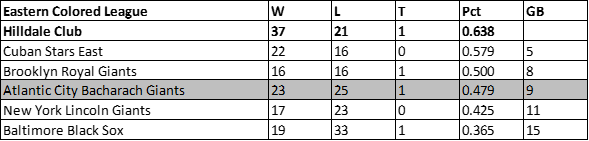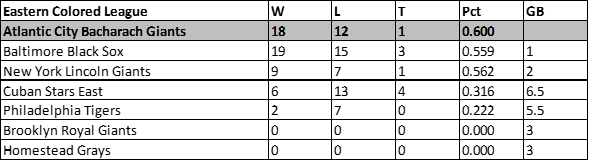 The Bacharach Giants finished atop the ECL, during the abbreviated season. Disagreements between owners caused the league to stop in mid-season and cease to exist. George Carr, Dick Lundy, Fats Jenkins, Chaney White and Clint Thomas all hit well above .300 during the brief season.