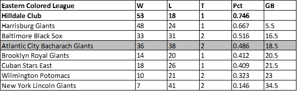 Rats Henderson had over a third of the Giants victories with eight but also lead the league in losses with 11. Closer, Bob McClure, also had 11 losses to pair with 3 wins. The Atlantic City Bacharach Giants would dissolve after the 1929 season.