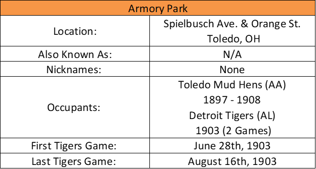 Uncategorized Armory Park (Toledo) Date: August 25, 2022Author: willb2032 0 Comments Philadelphia Athletics (7) vs. Detroit Tigers (3) June 28th, 1903 New York Highlanders (8) vs. Detroit Tigers (12) August 16th, 1903 Share this: Click to share on X (Opens in new window) X Click to share on Facebook (Opens in new window) Facebook Like Loading... Related