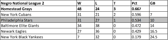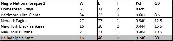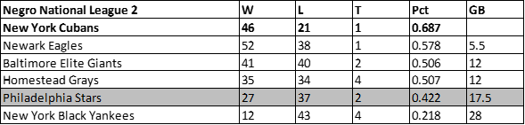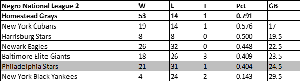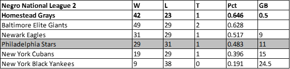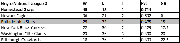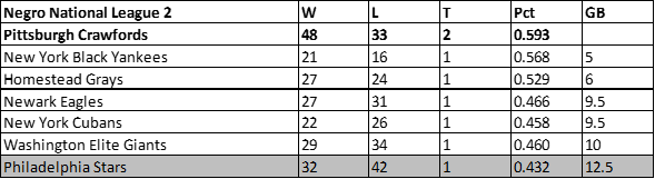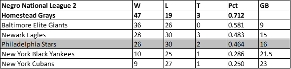 Despite winning six more games than the prior campaign, the Philadelphia Stars dropped to fifth place in the Negro National League in 1946. The Stars would finish with a 31-36-2 record, 17.5 games behind the newly championed Newark Eagles.