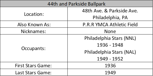 The Philadelphia Stars moved into the ballpark at 44th and Parkside for the 1936 season after playing the previous two years at Passon Field. Their new surroundings did not help the team on the field or in the standings as they finished at the bottom of the Negro National League at 32-42-1.